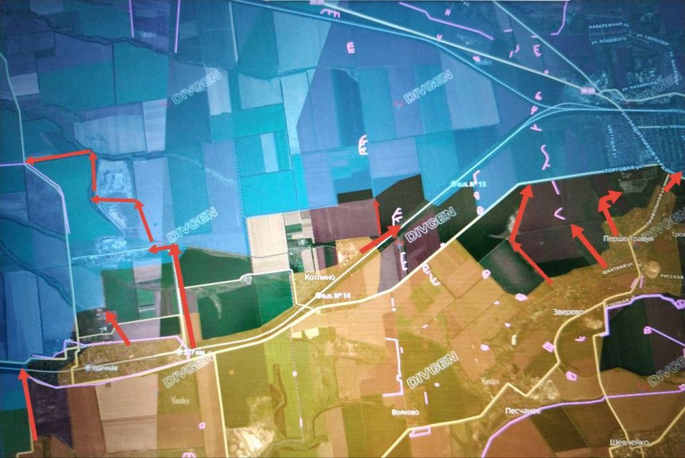 Восточнее Удачного ВС РФ вдоль ж/д прорвались к шахтоуправлению (с восточной стороны) и удачненскому террикону, далее к балке Матюшина в направлении Сергеевки и к дороге С050960 (Сергеевка — Удачное). Для противника возникла угроза прорыва наших подразделений к трассе М-30 (из Павлограда, до неё 4,5 км) на участке между Сергеевкой и Гришино к Сергеевке, через которую шло всё снабжение в районе Котлино — Удачное — шахтоуправление. Если удастся закрепиться и развить успех, то у ВСУ намечается что-то в роде ещё одного "Добропольского" прорыва (или плюсом ещё и "Павлоградского").