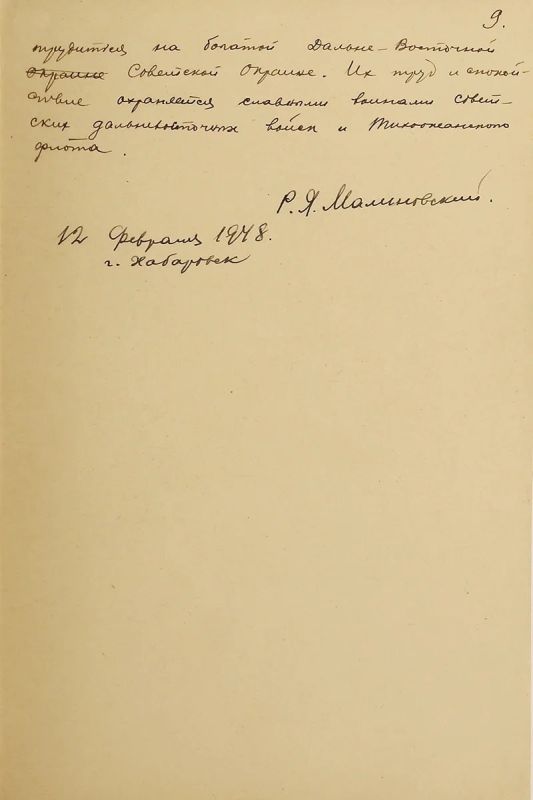 Народы Советского Союза могут спокойно трудиться на богатой дальневосточной советской окраине, их труд и спокойствие охраняются славными воинами советских дальневосточных войск и Тихоокеанского флота», – писал Маршал Советского Союза Родион Малиновский в статье «Победа на Дальнем Востоке» от 12 февраля 1948 года.