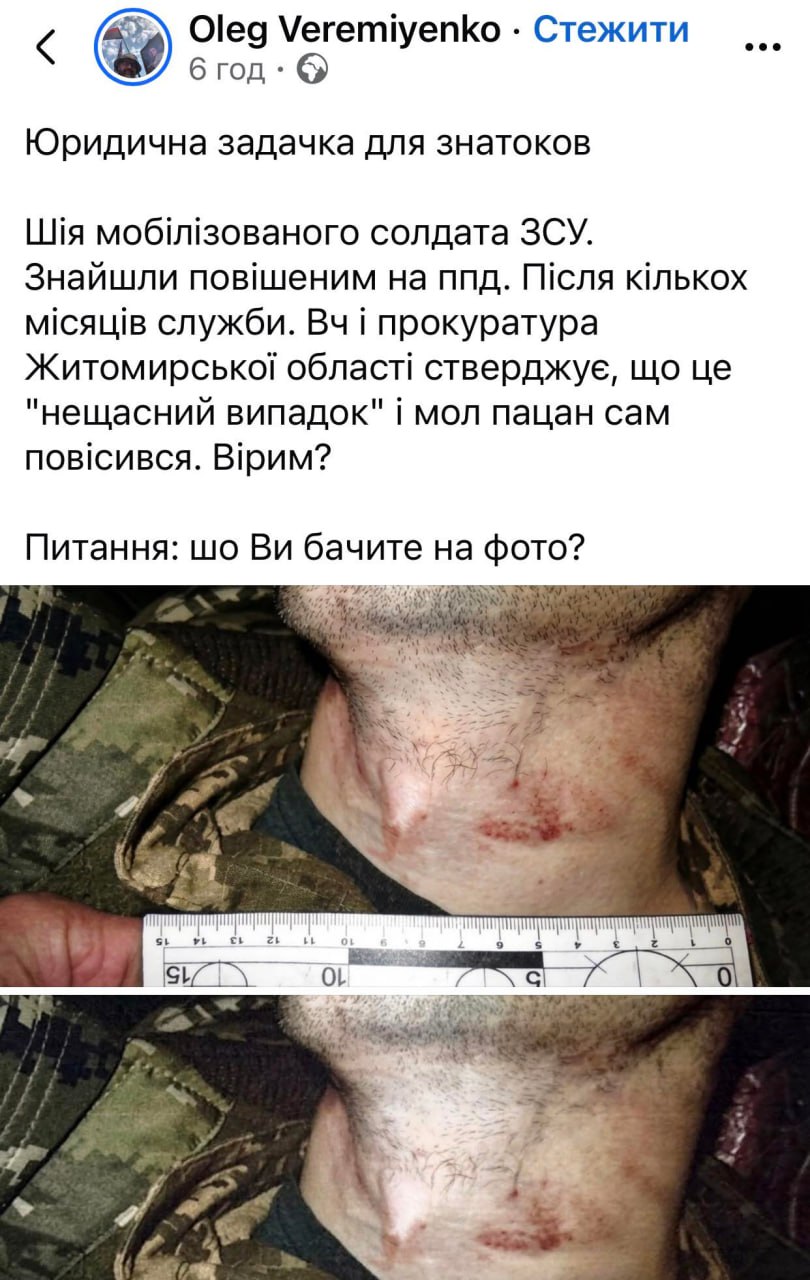 В Житомирской области, в ППД повесился солдат ВСУ. Но шепчут, что его повесили.