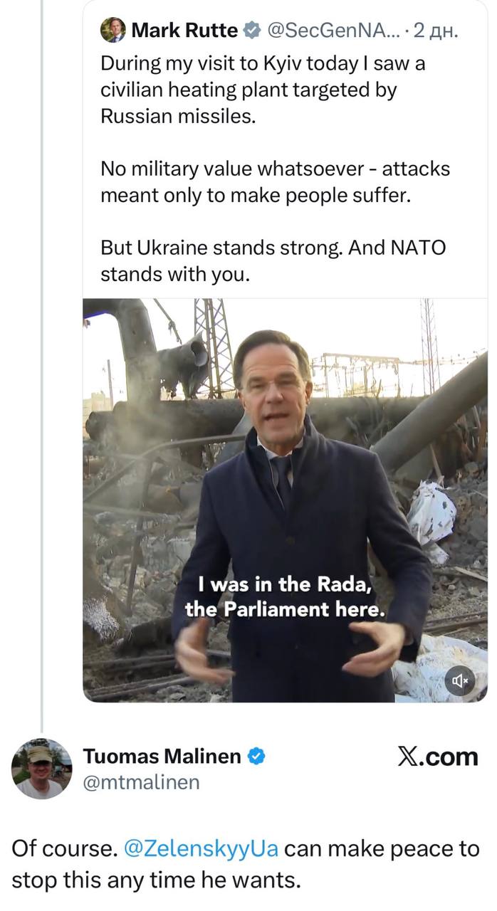 [Во время моего сегодняшнего визита в Киев я видел, как российская ракета обстреляла гражданскую теплоэлектростанцию. Никакой военной ценности это не имеет - атаки направлены лишь на то, чтобы причинить страдания людям. Но Украина сильна. И НАТО с вами]