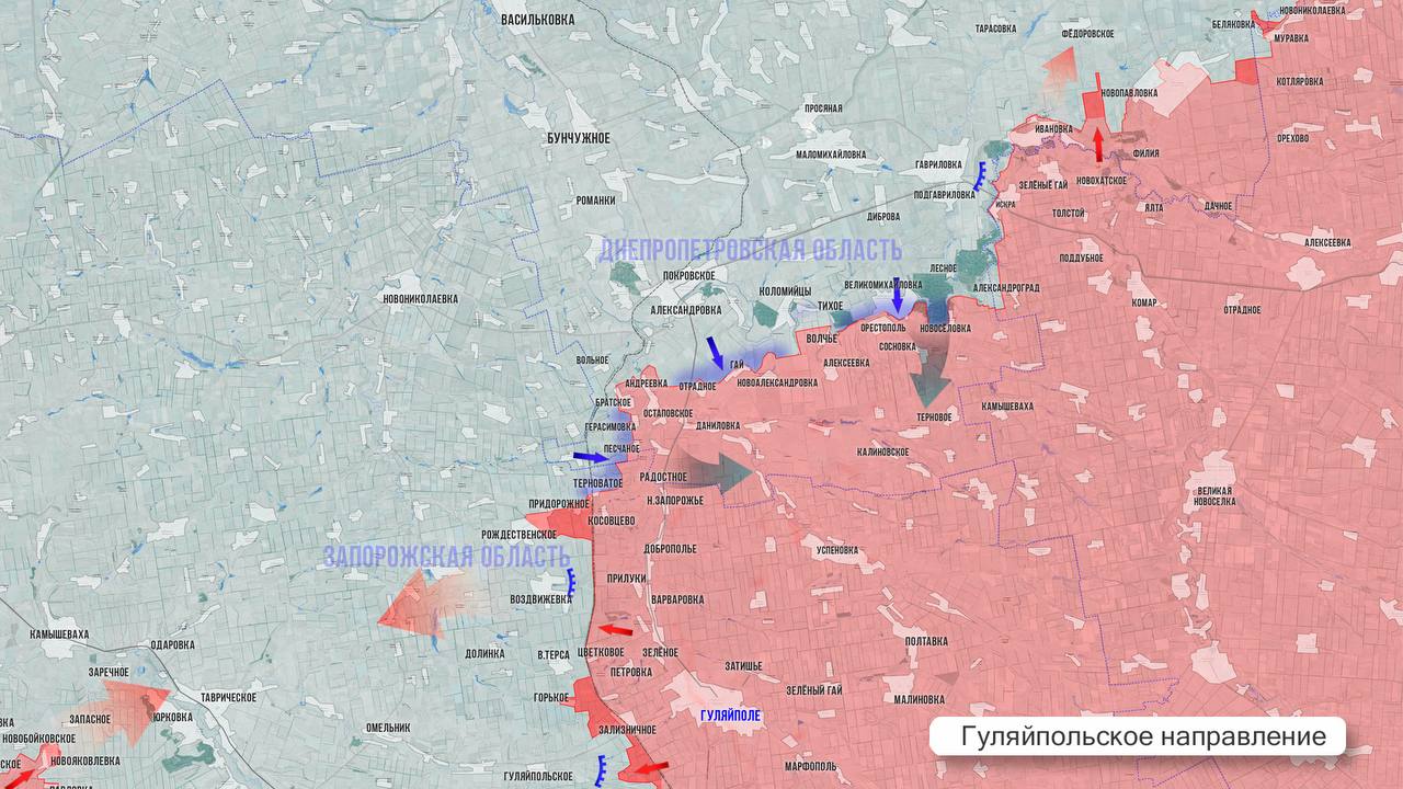 На Гуляйпольском фронте ВС РФ развивают наступление в районе Гуляйпольского. Продолжаются бои на окраинах Верхней Терсы, а также в Воздвижевке и Рождественском. Противник не контратаковал и сосредоточился на ротации позиций. Наши бойцы «поймали» врага на марше в районе сёл Писанцы и Добропасово на северном фланге и противник понёс серьёзные потери.