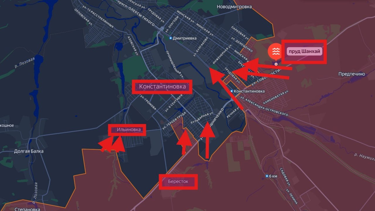 Группировка «Юг» отработала по бандеровцам в Константиновке. Наши штурмовые группы продвинулись до грунтовой дороги вдоль лесопосадок на Ступочки, а также в районе Шанхайского ставка. ВКС ежедневно утюжат трёхтонными ФАБами многоэтажки, где враг прячет пункты управления дронами. На юго-восточной окраине города и у Берестка продолжаются наступательные действия.