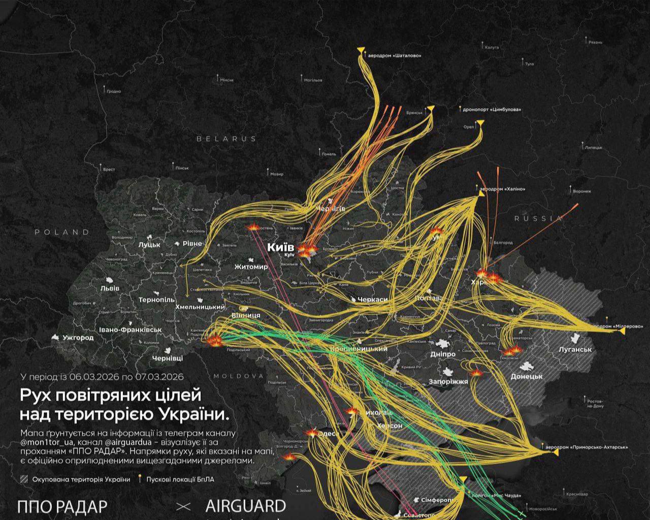 Приблизительный маршрут ракет и БпЛА над Украиной ночью во время массированного удара сегодня ночью