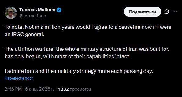 "Ни за что на свете я бы не согласился на прекращение огня, будь я генералом КСИР. Война на истощение, для которой и была создана военная структура Ирана, только началась, и большая часть его возможностей остается нетронутой. Я все больше восхищаюсь Тегераном и его военной стратегией с каждым днем", — заявил профессор Хельсинкского университета Туомас Малинен.